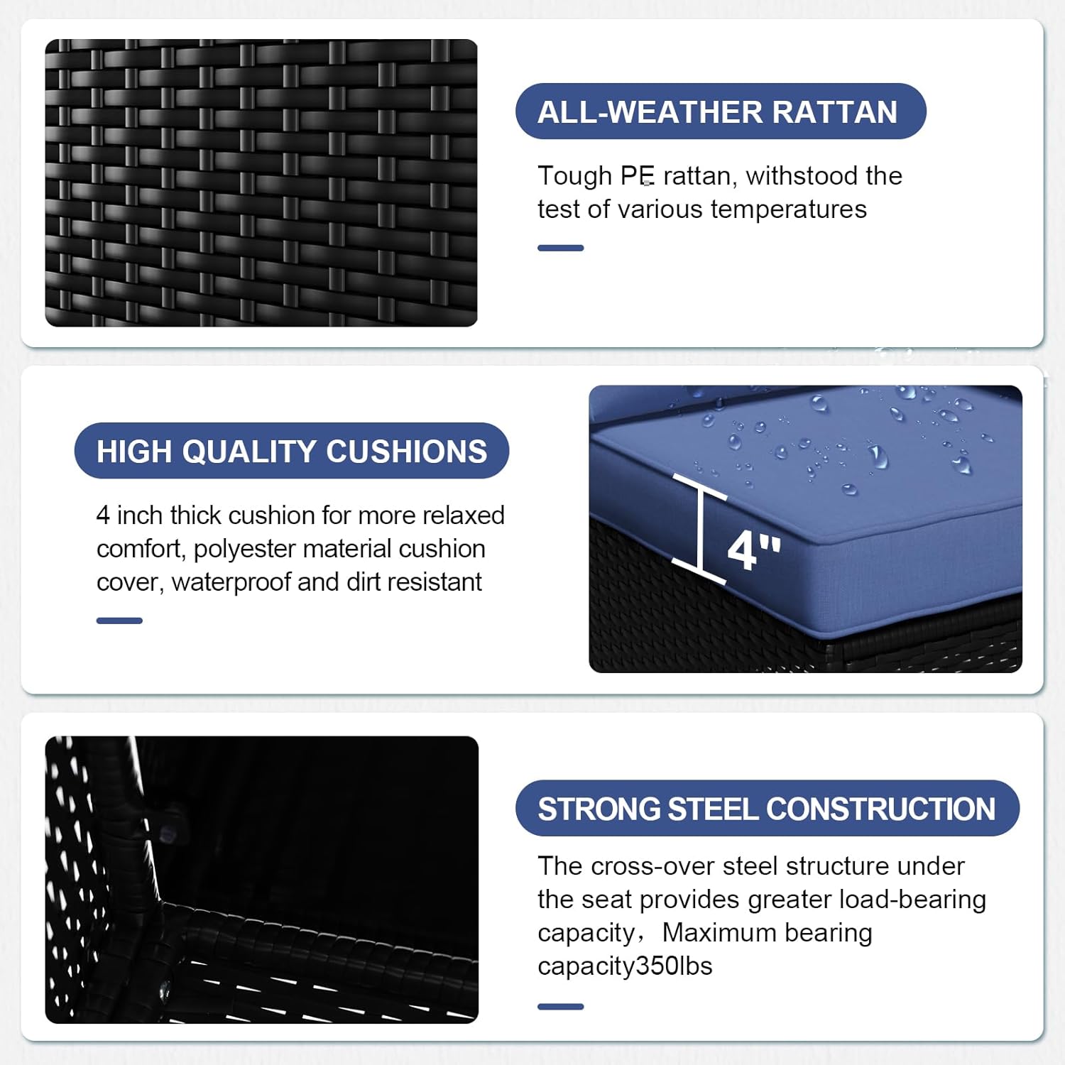 Wicker and cushion covers are designed to tolerate moisture, and cushions are described as “thick waterproof,” but you’ll still want to avoid prolonged saturation of the interior foam. Use covers and store cushions during extended wet periods to prevent mold and foam degradation.