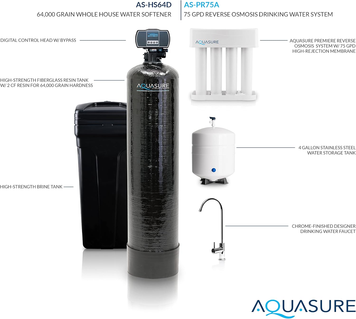 Aquasure 64,000 Grains Whole House Water Filter Bundle with Automatic Digital Metered Control Softener and 75 GPD RO Reverse Osmosis Drinking System | Removes Hardness | Ideal for 4-6+ bathrooms