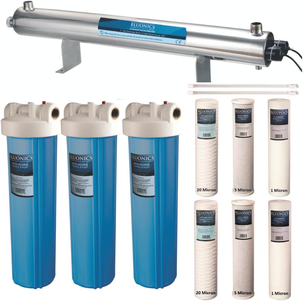 Bluonics Complete Well Water Whole House Water Filtration System 3-Stage with 110W UV 24GPM and One Extra Filters Sets, Activated Carbon Block, Sediment 20mic and 5mic Filters