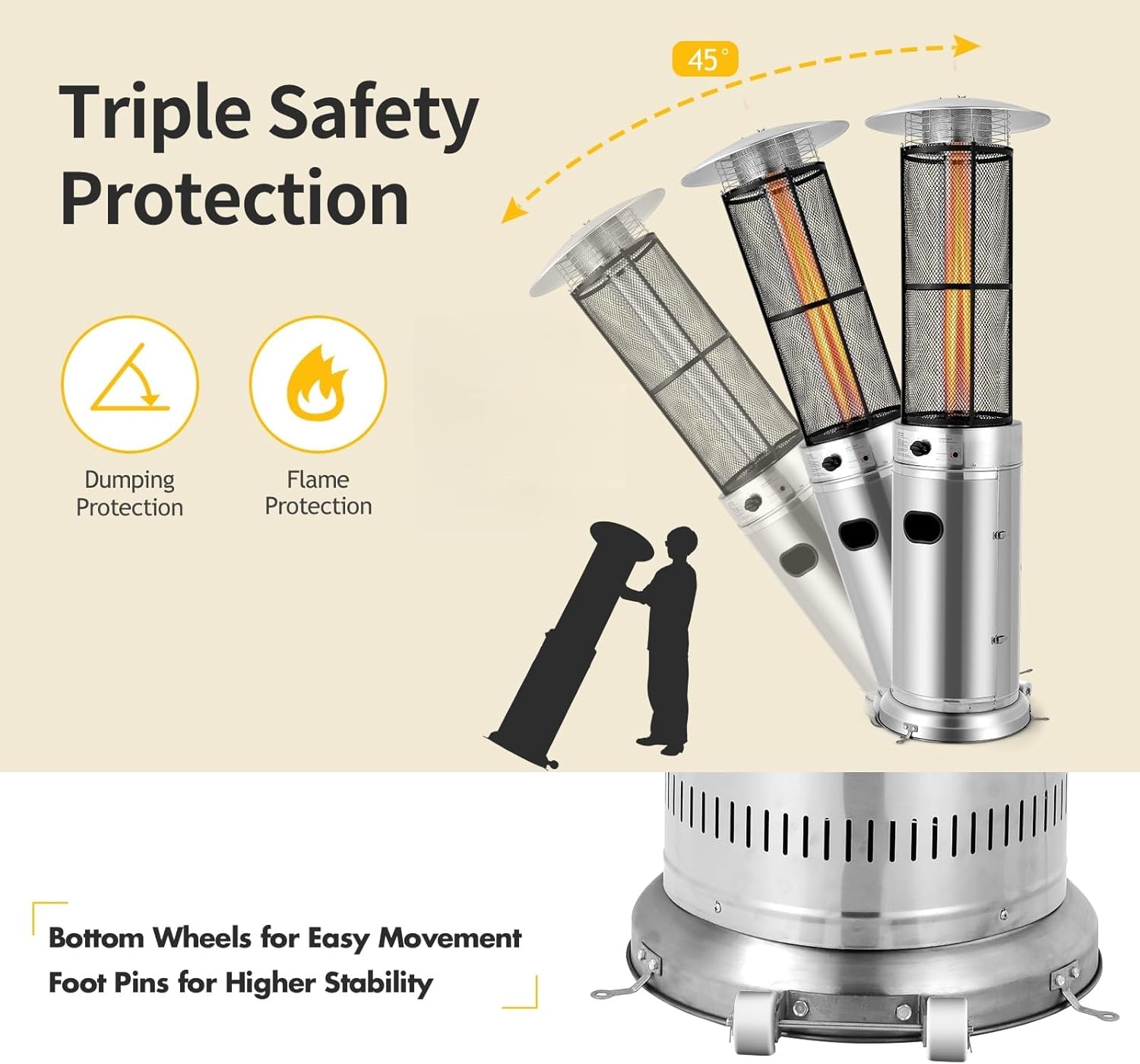 | Model | Tangkula Outdoor Heater, 40,000 BTU Stainless Steel Outdoor Patio Heater with Wheels, Quartz Glass Tube, Tip-over & Flameout Protection |